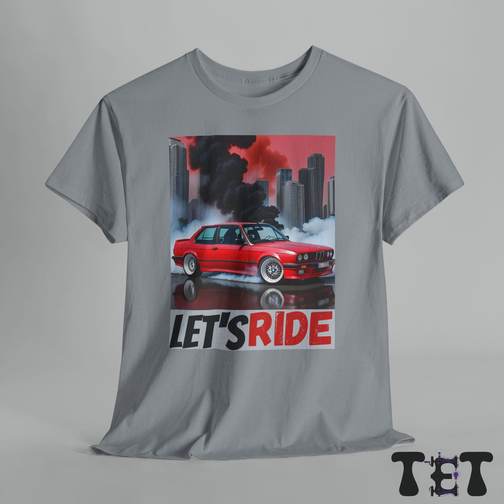 Fuel your passion for urban racing with our BMW Street Racer Tee. Designed for true car enthusiasts, this bold red tee showcases a dynamic BMW amidst a vibrant cityscape, swirling smoke effects, and the energizing call-to-action 'LET'S RIDE' in striking typography. Perfect for lovers of street race culture and BMW performance.