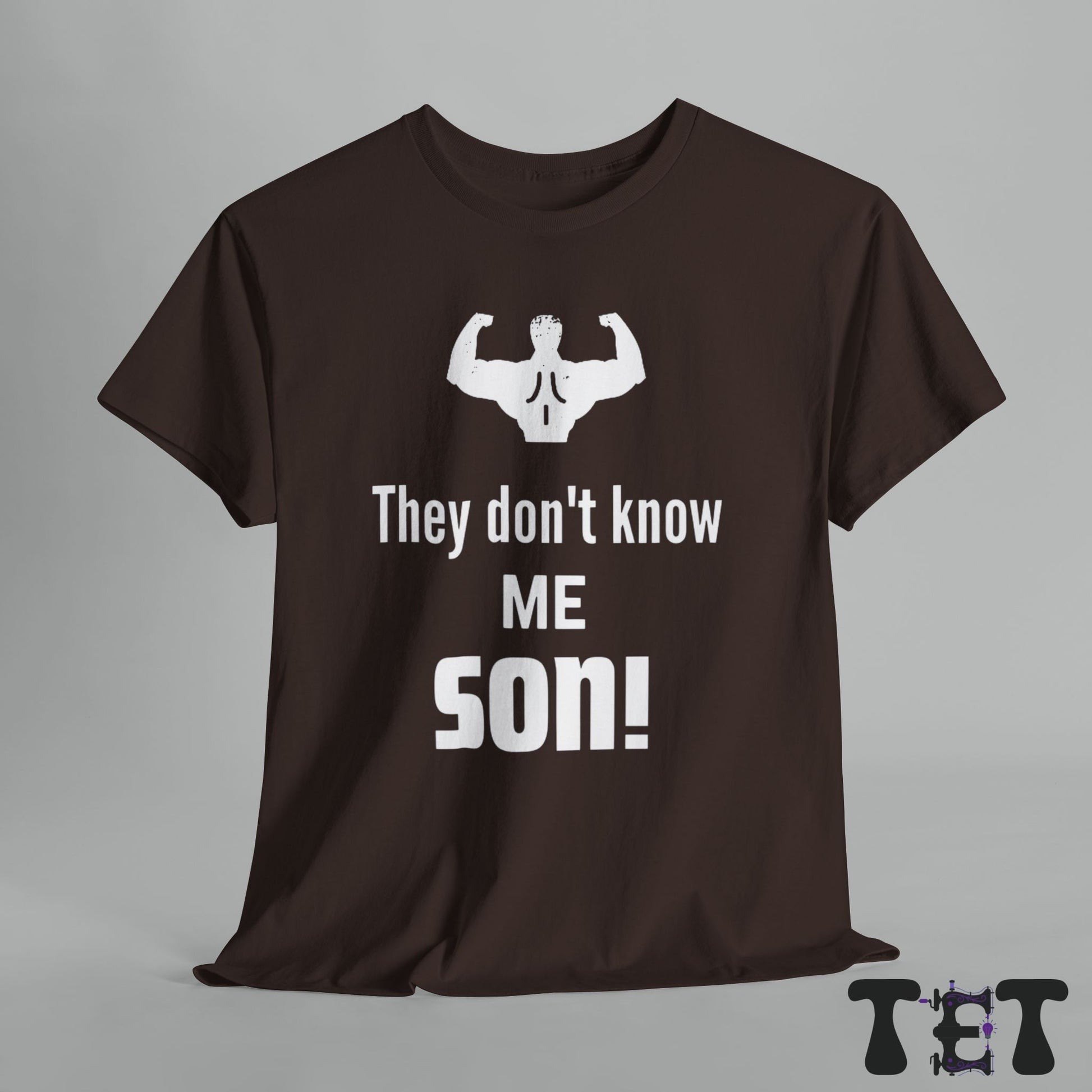 Unlock your inner strength with this bold, street-ready T-shirt. Featuring a striking white silhouette flexing against a black backdrop and the empowering phrase 'They Don't Know ME SON!', this design channels David Goggins' relentless drive and UK street vibe. Perfect for gym enthusiasts and urban warriors looking to make a statement.